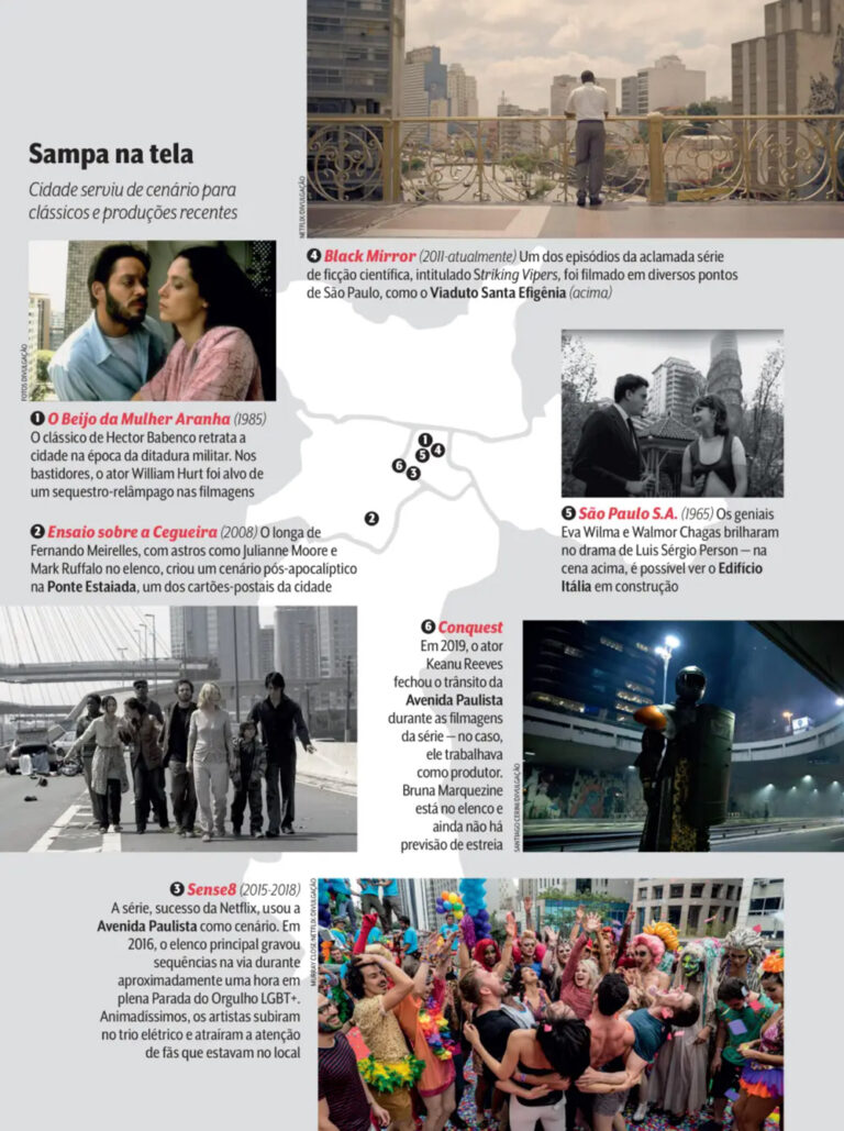 É um mercado que passa a dispôr de um cardápio de 500 cenários na cidade, mais uma ajuda à retomada pós-pandêmica. Pano de fundo de clássicos como O Beijo da Mulher Aranha (de 1985, com cenas filmadas no Minhocão e no Metrô Bresser e gênios como Sônia Braga, Raul Julia e José Lewgoy no elenco), São Paulo surfa a onda das séries e influencers sem perder o charme.